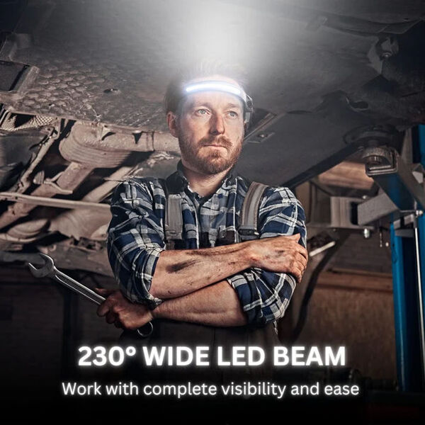 Illumina l’intera area di lavoro con un fascio grandangolare a 230°. Questa lampada frontale offre una visibilità chiara e intensa in tutte le direzioni, ideale sia per interni che per esterni.
